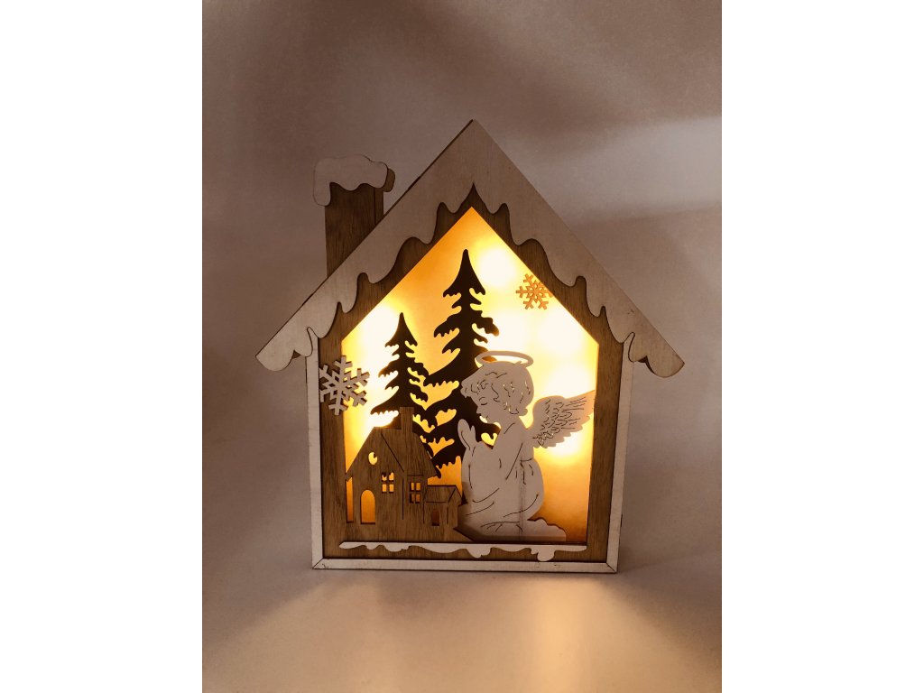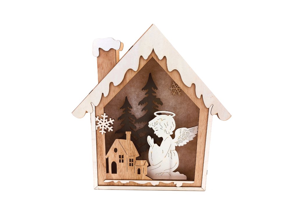 Objevte kouzlo dřevěné svítící dekorace ve tvaru domu, kterou zdobí roztomilý modlící se andílek. Tato jemná dekorace přinese do vašeho domova pocit klidu a ochrany, ideální pro vytvoření útulné atmosféry v každé místnosti.