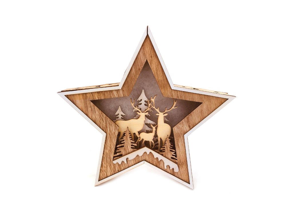 Dřevěná svítící dekorace hvězda - Jeleni s kolouškem