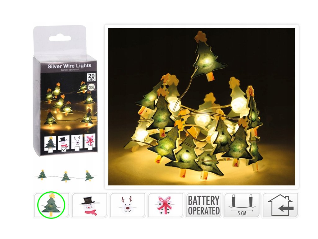 Řetěz má délku 95 cm a navíc 10 cm přívodního kabelu, přičemž mezi jednotlivými LED diodami je rozestup 5 cm, což vám umožňuje přesné a rovnoměrné rozmístění světel. Celkem obsahuje 20 malých stromečků, které dodávají dekoraci svěží a originální vzhled.