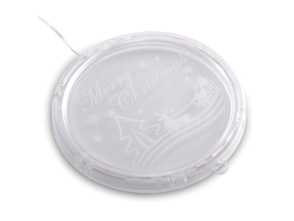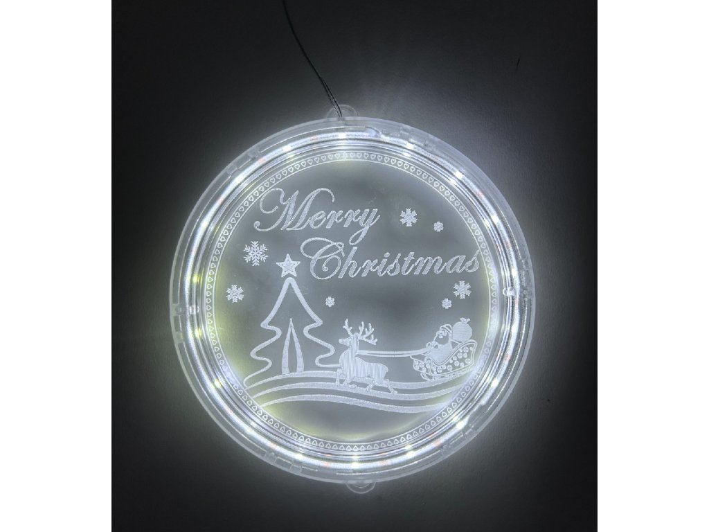 Vánoční LED závěsná dekorace kulatá - Merry Christmas (Santa a sob) Studená bílá