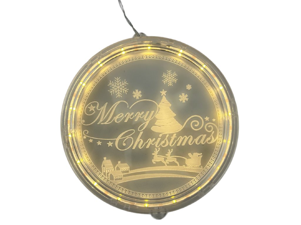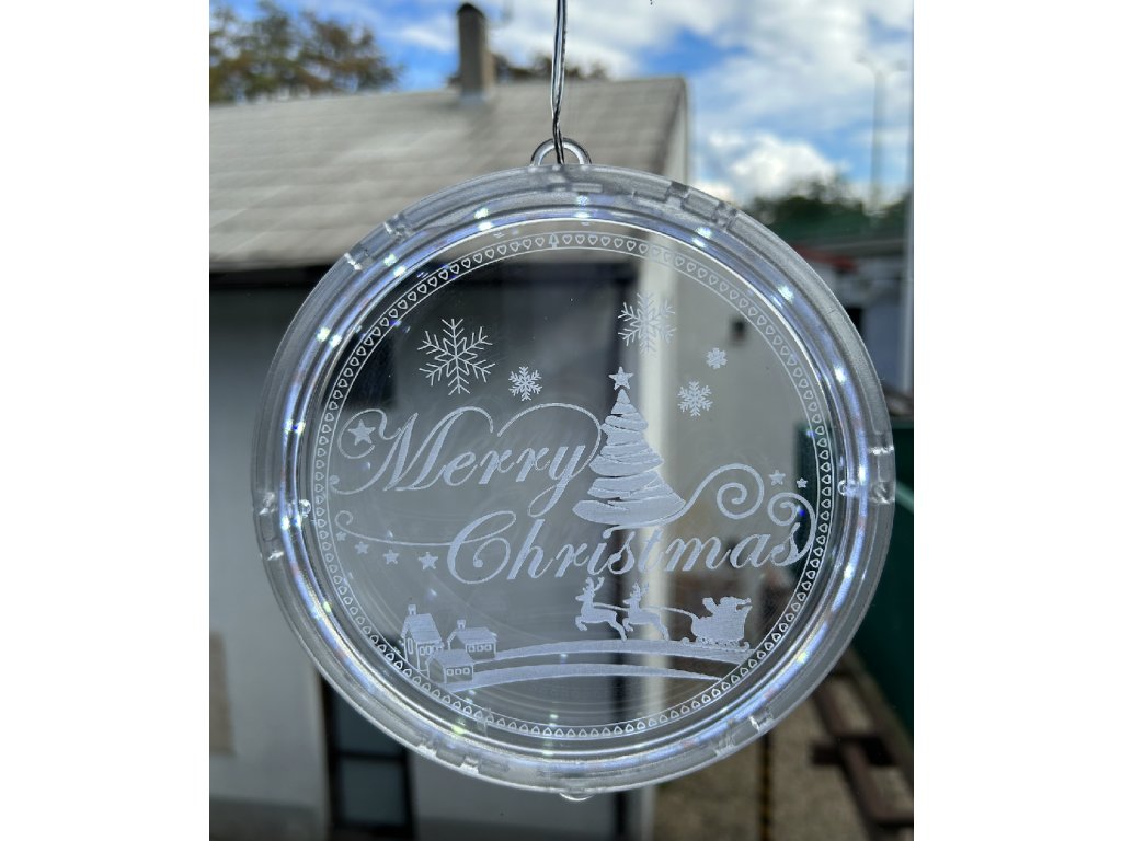 Vánoční LED závěsná dekorace kulatá - Merry Christmas (Santa a sobí spřežení) Teplá bílá